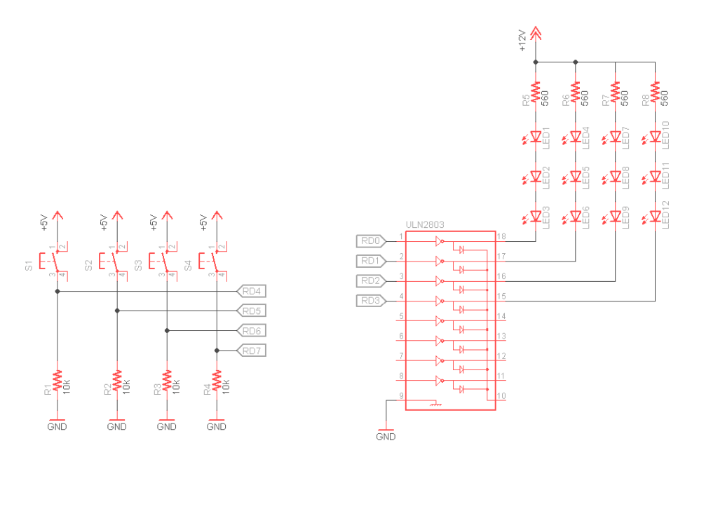 Dallo schema vediamo che i pulsanti in condizioni di riposo (non premuto), inviano al pin uno stato logico basso tramite le resistenze da 10K; premendo il pulsante tale linea viene portata a VDD e pertanto sul pin avremo un livello logico alto.