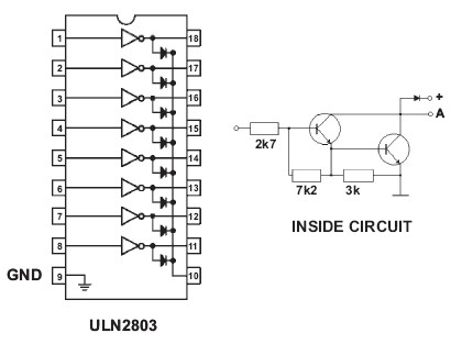 Questo IC accetta input sugli ingressi da 1 a 8, con tensione compatibile TTL, quindi fino a 5 V, mentre i pin di uscita vanno da 11 a 18. Quando un ingresso è Low la rispettiva uscita è in alta impedenza, come se fosse un interruttore aperto e, quindi, non emette ne assorbe corrente. Quando un ingresso è High la rispettiva uscita conduce a massa, quindi assorbe corrente. Tale tipologia di uscita è chiamata Open Collector: o non conduce, o collega a massa. Quindi occorre predisporre una sorgente di tensione, esterna all’integrato, che alimenti il dispositivo collegato alla sua uscita e scarichi corrente a massa attraverso di esso. Infatti nell’integrato è presente solo il pin 9 di Ground ma non c’è il pin di alimentazione. Il pin 10 è detto “common free wheeling diodes” e servirebbe nel caso di carichi induttivi che potrebbero suscitare picchi di tensione, quindi va collegato a VCC in modo che i diodi possano scaricare tali picchi. Le principali caratteristiche di questo integrato sono: