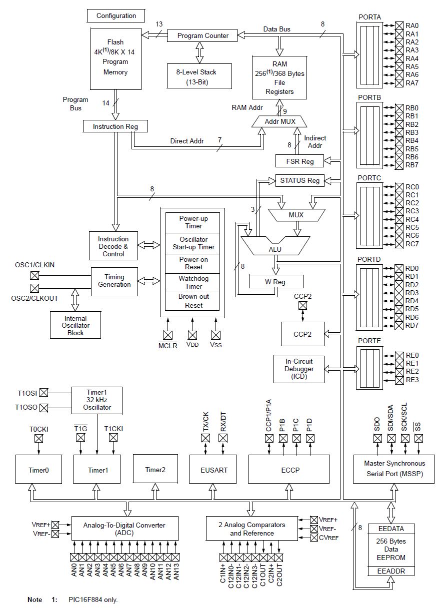 - Dispone di molte periferiche interne, tra cui: 3 timer, un convertitore A/D a 14 canali con una risoluzione di 10bit, un modulo PWM con una frequenza massima di 20MHz, due comparatori analogici, USART interno implementato a livello hardware e una EEPROM interna di 256 byte.