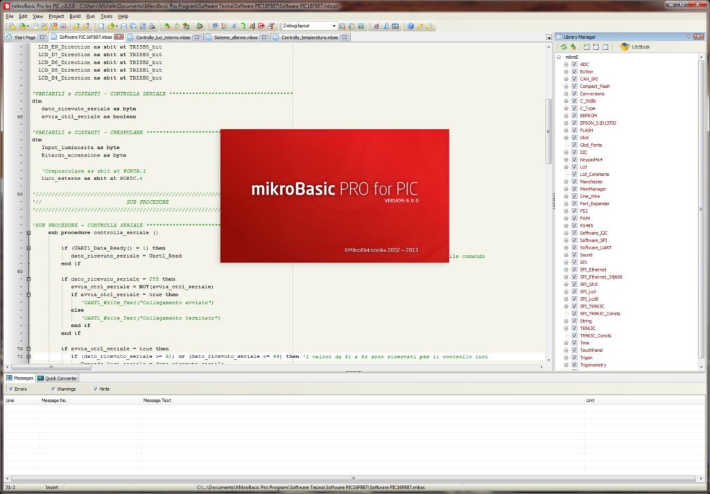 Per programmare i due microcontrollori si è fatto uso del compilatore “mikroBasic”, messo a disposizione direttamente dall’azienda Microchip in versione freeware, e facendo uso del linguaggio BASIC. Contiene al suo interno già tantissime librerie per gestire tutte le periferiche presenti nei PIC, tra cui quelle per l’ADC, l’UART, il PWM, i Display, etc. ad esempio la librerie ADC si occupa di gestire molto semplicemente l’acquisizione di segnali analogici da un canale o di generare una forma d’onda rettangolare con la libreria PWM.