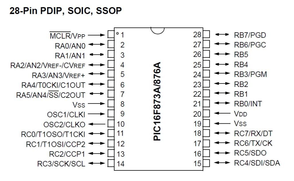 Il microcontrollore PIC16F876A può essere definito il fratello minore del 16F887 in quanto presenta le stesse caratteristiche elettriche e di configurazione, la differenza sta nel numero di pin e nel numero inferiore di funzioni. Il package è un PDIP a 28 piedini e di seguito troviamo la sua piedinatura:
