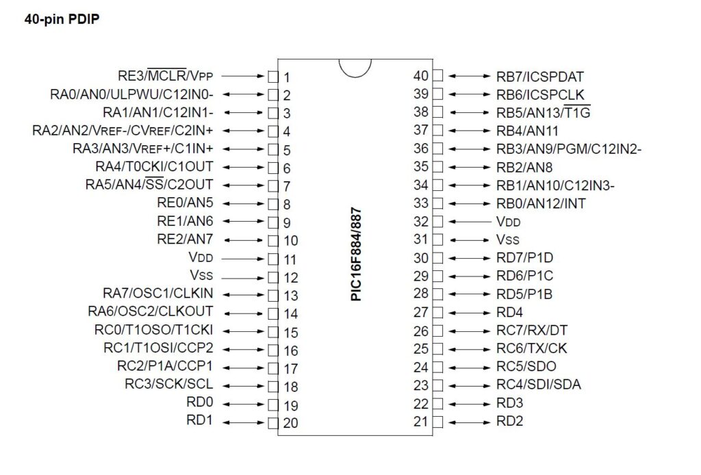 Il package del microcontrollore è un PDIP a 40 piedini, i suoi terminali spesso svolgono più funzioni e tutte le funzioni del microcontrollore (modalità terminali input o output, periferiche, interrupts, etc) sono selezionabili tramite dei registri di configurazione interna. La piedinatura del PIC16F887 è a seguente: