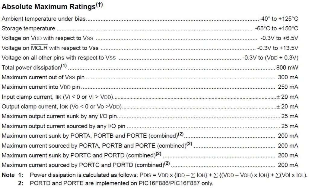 Anche i microcontrollori hanno dei valori massimo che non devono superare per salvaguardare la vita dell’integrato. Questi valori, sempre, riportati nei datasheet sono i seguenti per il PIC16F887: